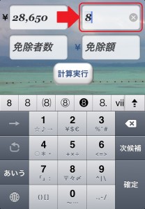 この場合、「総額」の入力欄をタッチすると、キーボードがあらわれますので、数字キーボードから「28,650」と入力して、「人数」の入力欄にタッチして数字キーボードから「8」と入力します。